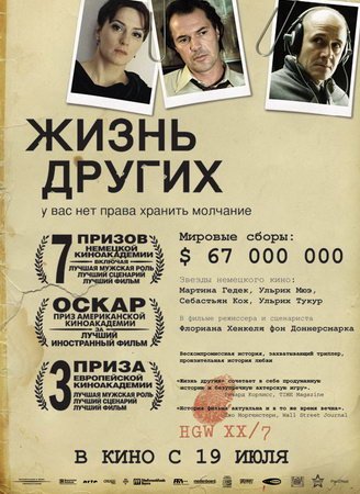 Режиссер: Флориан Хенкель фон Доннерсмарк / Florian Henckel von Donnersmarck описание: Повествование фильма разворачивается в Восточном Берлине в 1984 году за пять лет до падения Берлинской Стены. Агент «Штази» Герд Визлер, преданный социалистическим идеалам высококлассный специалист, усомнился в благонадежности театрального драматурга Георга Дреймана и по заданию полковника Грубитца поставил на прослушивание его квартиру. Вскоре Визлер, получивший доступ к чужой жизни, проникается симпатией к человеку, за которым вынужден следить с утра до ночи. Сюжет осложняется любовной историей Дреймана и его девушки, актрисы Кристы-Марии. Их чувства друг к другу являются воплощением творческой и личной свободы людей того времени, и подвергаются серьезной проверке режимом. Страдания незнакомых людей в стране, которую он так любит, постепенно меняют и самого Визлера...
